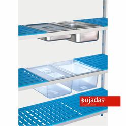 A Pujadas GN méretű polcaival egyszerűen berendezhetőek a raktárak, mivel összesen 564 féle különböző variációs lehetőséget kínálnak készen, és még ezen túl mi magunk is kialakíthatunk számos elrendezést. A polcok kétféle mélységben készülnek, 555 mm mély a GN 1/1 edényekhez, 385 mm mély a GN 2/3 edényekhez. Természetesen GN edény nélkül is használható saját polcelemekkel. A váz háromféle magasságban: 1300mm, 1750 mm, és 2000 mm rendelhető. A sarokelemek segítségével akár egész helyiségeket is berendezhetünk így növelve a rendelkezésre álló terület kihasználtságát.